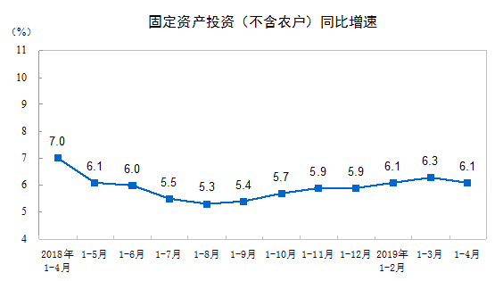 2019年1-4月份,全國固定資產(chǎn)投資(不含農(nóng)戶)155747億元,同比增長6.1%,增速比1-3月份回落0.2個百分點(diǎn)。從環(huán)比速度看,4月份固定資產(chǎn)投資(不含農(nóng)戶)增長0.45%。其中,民間固定資產(chǎn)投資93103億元,同比增長5.5%,增速比1-3月份回落0.9個百分點(diǎn)。