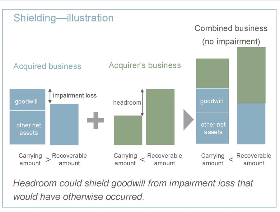 掩護(hù)效應(yīng)(Shielding)和凈空值(headroom)是近年來IASB重點(diǎn)研究的領(lǐng)域之一,因?yàn)檫@確實(shí)是商譽(yù)會(huì)計(jì)處理和減值測(cè)試模式中所無法回避且被重點(diǎn)詬病的問題:掩護(hù)效應(yīng)指包含商譽(yù)的現(xiàn)金產(chǎn)出單元或現(xiàn)金產(chǎn)出單元組通常含有凈空值,而凈空值使購(gòu)入商譽(yù)能免于確認(rèn)減值損失,導(dǎo)致減值測(cè)試產(chǎn)生問題,見以下示意圖。