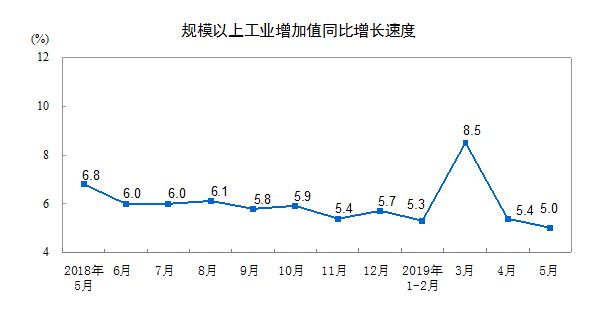 2019年5月份,規(guī)模以上工業(yè)增加值同比實際增長5.0%(以下增加值增速均為扣除價格因素的實際增長率),比4月份回落0.4個百分點。從環(huán)比看,5月份,規(guī)模以上工業(yè)增加值比上月增長0.36%。1-5月份,規(guī)模以上工業(yè)增加值同比增長6.0%。