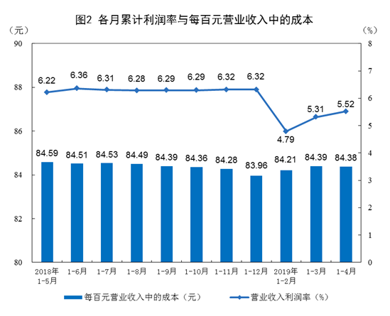 1—4月份,規(guī)模以上工業(yè)企業(yè)每百元營業(yè)收入中的成本為84.38元,同比增加0.22元;每百元營業(yè)收入中的費(fèi)用為8.73元,同比增加0.24元。