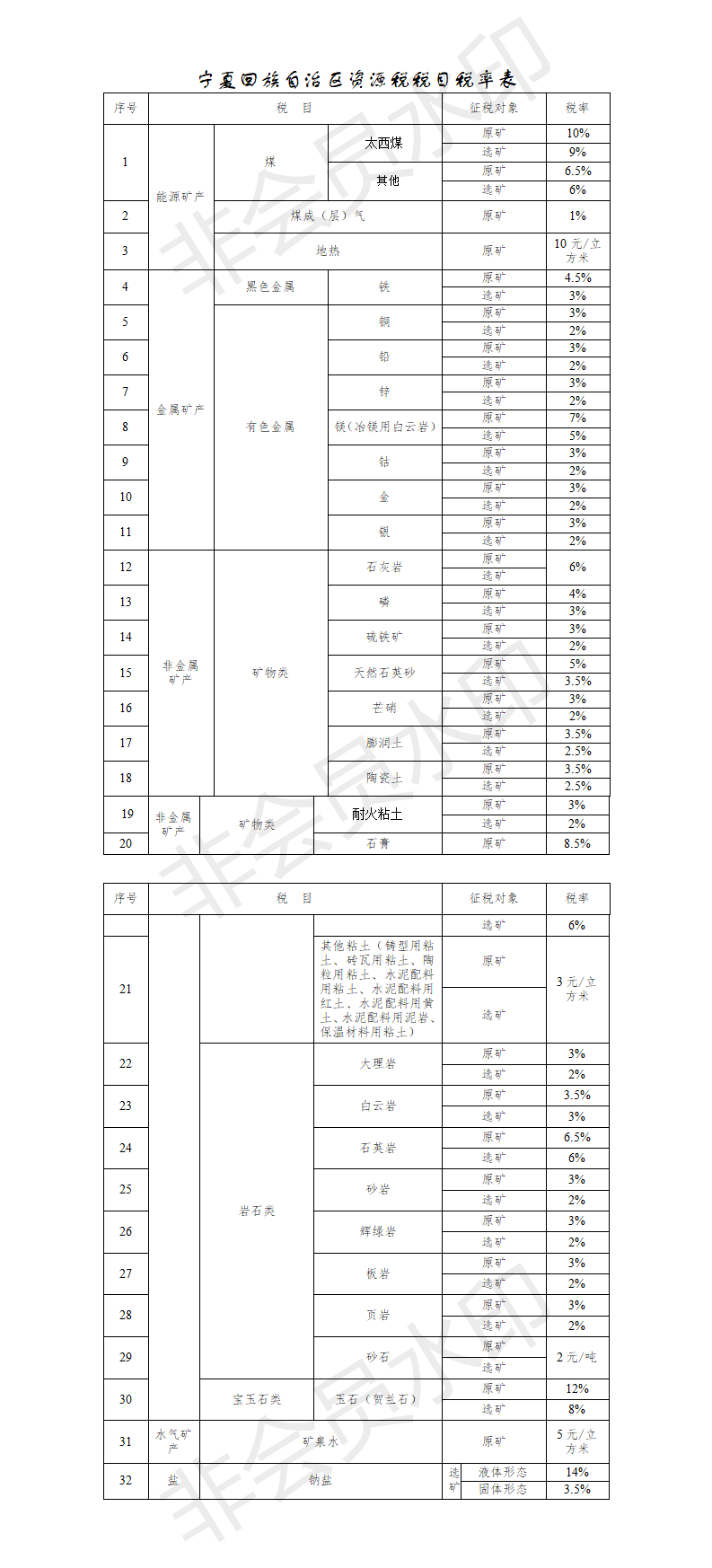 關(guān)于寧夏回族自治區(qū)資源稅適用稅率等
